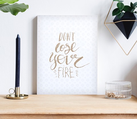 Motivační obraz YOUR FIRE s třpytivým nápisem DON'T LOSE YOUR FIRE dodá interiéru sílu, energii a inspiraci. Bílé pozadí, zlatý glitter efekt a moderní design. Rozměr 30 x 40 cm.