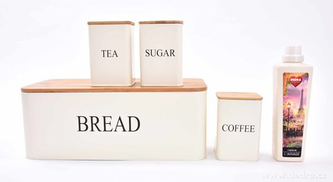4 ks SADA chlebníku a kovových dóz TEA, COFFEE, SUGAR, víka dóz i chlebníku jsou z vysokotlakého bambusu.