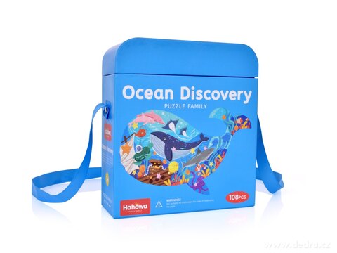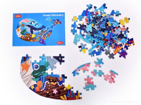 108 ks PUZZLE OCEÁN ve tvaru velryby, v praktickém kufříku s popruhem na přenášení, vyrobeno z pevného kartónu.