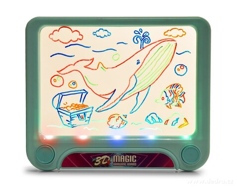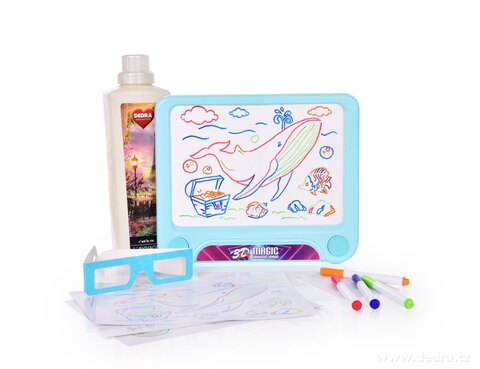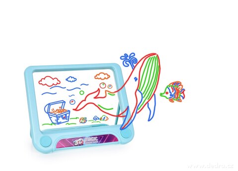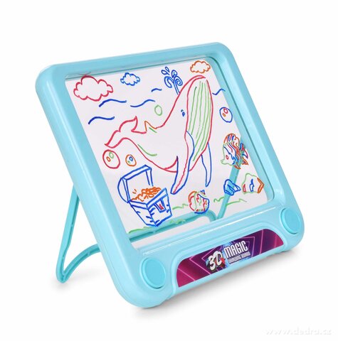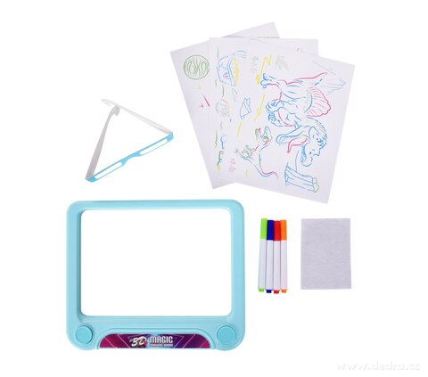 3D KOUZELNÁ KRESLÍCÍ TABULKA s LED osvětlením + 4 barevné fixy, 3D brýle, hadřík a 6 motivů na kreslení (2 motivy dinosaurů, 2 motivy vodního světa a 2 motivy vesmíru), v zadní části praktický stojánek, napájení 3x 1,5V AA.