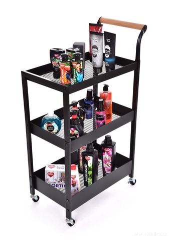MULTIFUNKČNÍ POJÍZDNÝ VOZÍK/regál, 3 patrový, se 4 kolečky a dřevěným madlem pro snadnou manipulaci. Perforované dno košíků pro snadné odvětrávání. Materiál: kov a dřevěná rukojeť. Rozměry: š 30 x h 51 (s rukojetí 57 cm) x v 93 cm (mezi poličkami 33 a 28 cm).