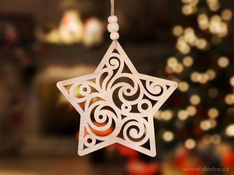 KRAJKOVÁ HVĚZDA působí jako jemně vyřezávaný klenot z přírodního dřeva. Její ornamentální vzor připomíná krajku, která vnese do interiéru pocit lehkosti a elegance. Doplňky v podobě jutového provázku a korálků zdůrazňují rustikální i skandinávský charakter dekorace.