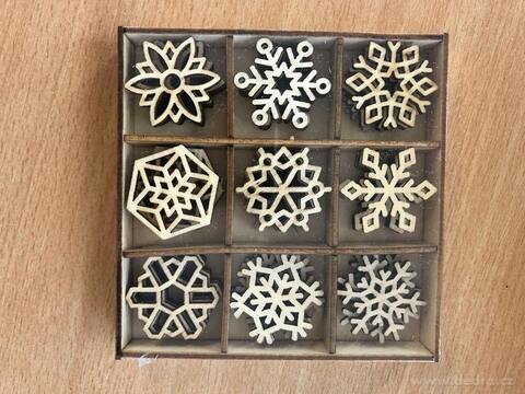 36 dřevěných sněhových vloček v různých designech v praktickém boxu. Krásná přírodní dekorace na stromeček, dárky nebo zimní aranžmá. Průměr 3 cm.