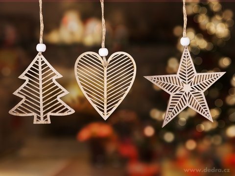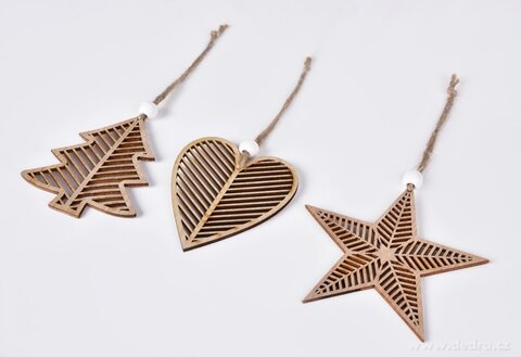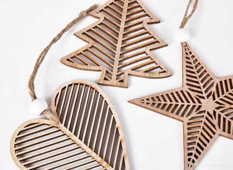 TŘI SYMBOLY VÁNOC spojují jednoduchost, eleganci a tradiční symboliku. Stromek přináší radost a naději, hvězda září jako světlo Vánoc a srdce připomíná lásku a rodinné teplo. Díky přírodnímu vzhledu dřeva působí ozdoby útulně a harmonicky, zároveň se snadno kombinují s jinými dekoracemi.