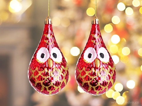 Roztomilé vánoční ozdoby VYKULENÉ SOVIČKY v červeném lesklém provedení se zlatými třpytkami. Sada 2 ks o výšce 12 cm přidá vašemu stromečku hravost, šarm a originální kouzlo.