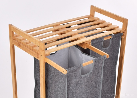 BAMBUSOVÝ REGÁL se 2 výsuvnými koši na prádlo z šedé melanžové látky, nahoře bambusová police.