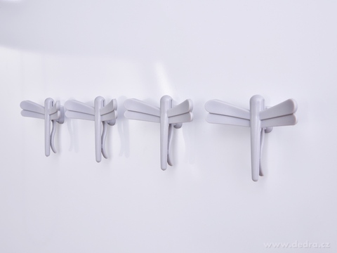 Sada 4 stylových magnetických háčků VÁŽKY v šedé barvě. Dva způsoby upevnění – magnetem na kovové povrchy nebo pomocí oboustranné pásky. Praktické háčky na ručníky, utěrky, tašky, kabely či uzavírání sáčků.