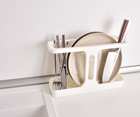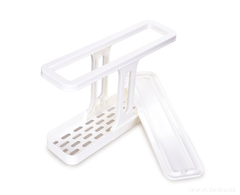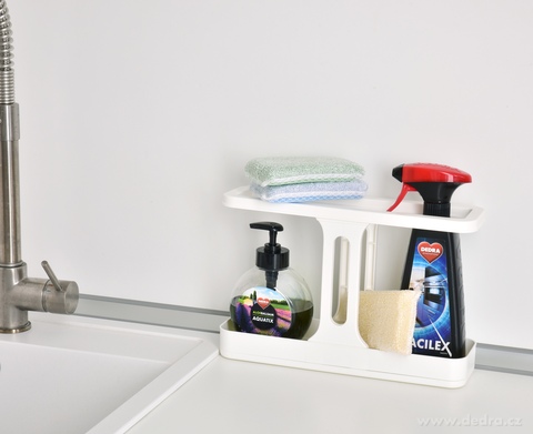 Praktický 2v1 kuchyňský stojan a odkapávač PRAKTIK slouží k ukládání houbiček, kartáčů, utěrek i prostředků na mytí nádobí. Odnímatelná spodní část umožňuje snadné vylévání vody. Udrží pořádek u dřezu a pomůže doplňkům rychleji uschnout.