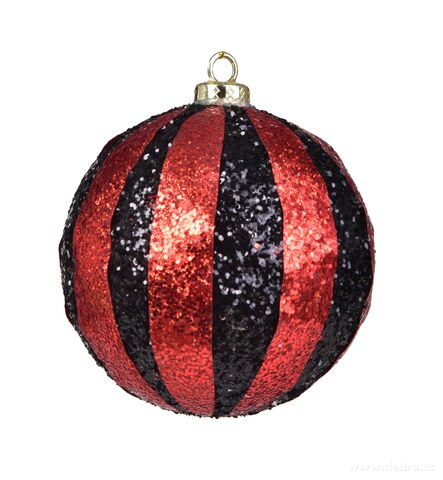 Výrazná vánoční koule ONYX & RUBÍN s černo-červenými pruhy a třpytivým efektem. XL ozdoba o průměru 9 cm dodá stromku styl, extravaganci a odvážný charakter inspirovaný drahokamy.