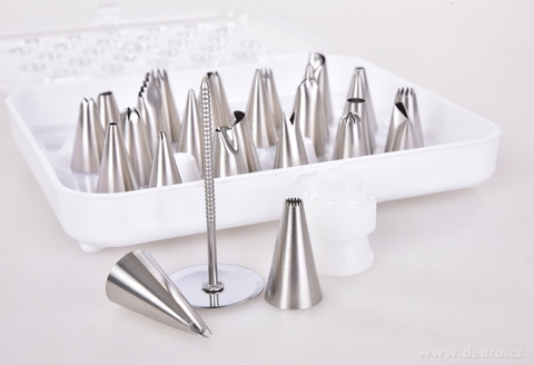 Sada 28 cukrářských špiček CREMO v praktickém kufříku pro zdobení dortů, zákusků, sušenek i slaných dobrot. Obsahuje i hřebíky a spojku. Ideální pro domácí i profi cukráře.