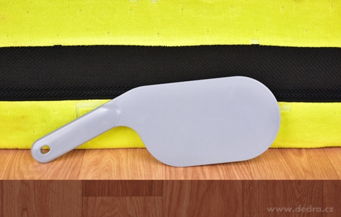 Vyrobena z pevného plastu. Celková délka 30 cm, pracovní část cca 17 × 10 cm.