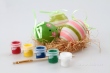 Balení obsahuje 4 kraslice (výška cca 6 cm), 5 vodou ředitelných netoxických barev a 1 štětec.