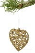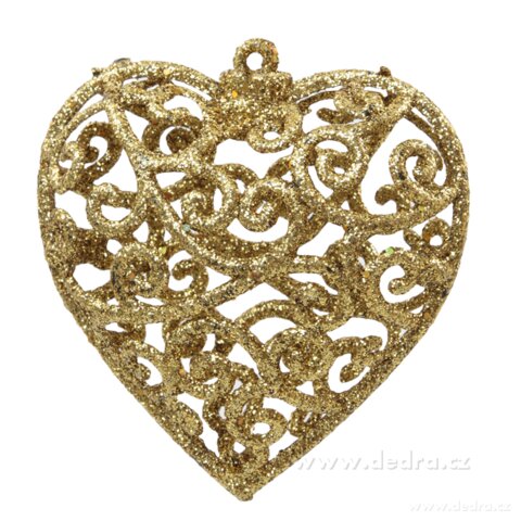 5 ks třpytivých srdíček krajkového vzhledu (perforované) zlaté, výška: 6,5 cm.