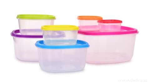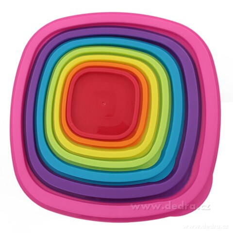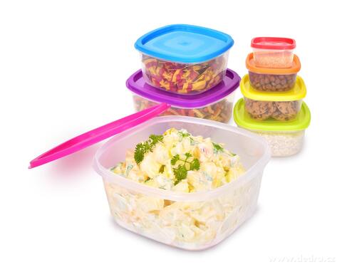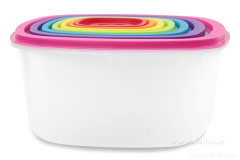 Praktická sada 7 plastových dóz s barevnými víky na uchovávání, přenášení a mražení potravin. Úsporně se skládají jedna do druhé, vhodné do myčky, mikrovlnky i mrazničky – ideální pro krabičkové diety a domácí skladování.