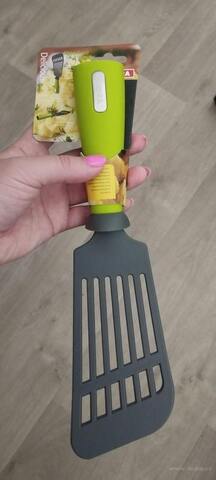 Unikátní funkce „Na stojáka“ umožňuje po použití postavit obracečku na rukojeť nebo ji položit tak, aby se pracovní část nedotkla pracovní plochy — vaše kuchyň zůstane čistá. Praktický okap zabraňuje stékání tekutin po rukojeti.