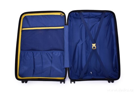 • uvnitř kufrů předělující membrána na zip a popruhy na zajištění šatstva.