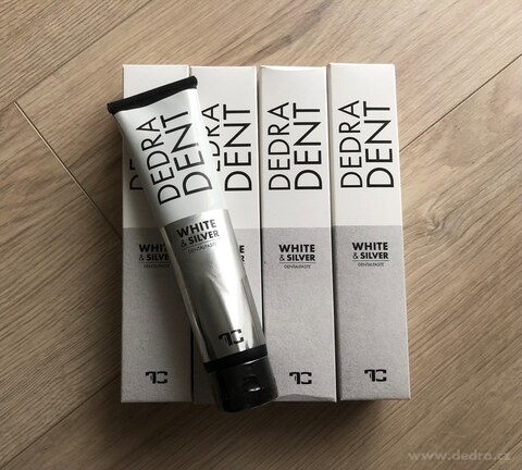 DEDRA DENT® WHITE & SILVER je luxusní přírodní bělící zubní pasta vyvinutá pro každodenní šetrnou péči o zuby a dásně. Díky unikátní složce Omyadent® s přírodním hydroxyapatitem a kalcium karbonátem obnovuje přirozenou remineralizaci skloviny a posiluje její odolnost. Jemná bělící báze z vápence šetrně odstraňuje pigmentace a nečistoty, aniž by poškozovala sklovinu.