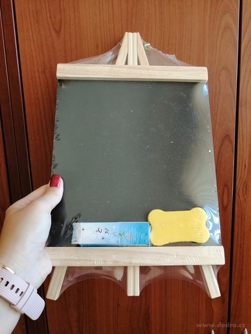 Drewniana tablica kredowa, stojąca. Zestaw zawiera 5 kolorowych kred (o długości 7,5 cm) i gąbkę.