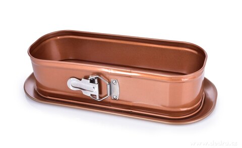 Duża owalna rozkładana forma z jakościową złoto-miedzianą powłoką nieprzywierającą premium BIOPAN® GOLD – idealna do wypieków oraz deserów bez pieczenia. Ta powłoka zapewnia doskonałe uwalnianie potraw, wysoką odporność na ścieranie i łatwe czyszczenie. Metalowa klamra umożliwia proste odpięcie obręczy, a praktyczne dno z tłoczeniem ułatwia wygodne przenoszenie oraz stylowe serwowanie.