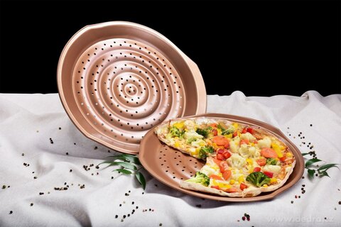 Praktyczna blacha z jakościową złoto-miedzianą powłoką nieprzywierającą premium BIOPAN® GOLD do pieczenia mrożonej pizzy, frytek i innych mrożonych przysmaków. Perforowane dno zapewnia optymalny przepływ gorącego powietrza, dzięki czemu spód zawsze będzie pięknie chrupiący, a góra soczysta.