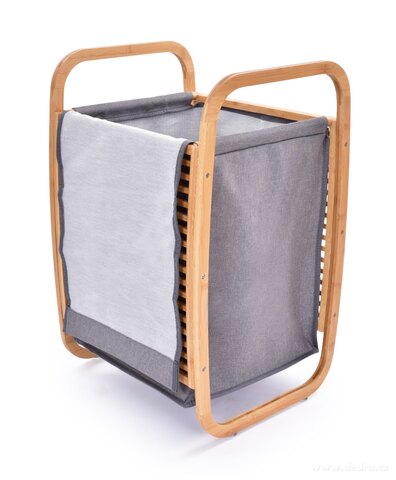 KOSZ NA PRANIE Z BAMBUSA z wyciąganym materiałowym workiem z melanżowej tkaniny i materiałowym wiekiem, w dolnej części 4 silikonowe podkładki dla lepszej stabilności.