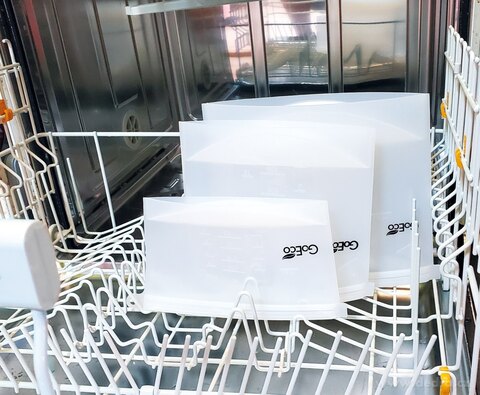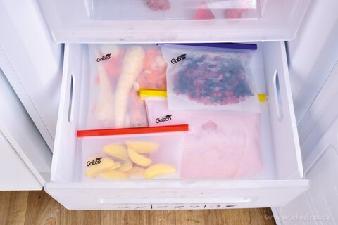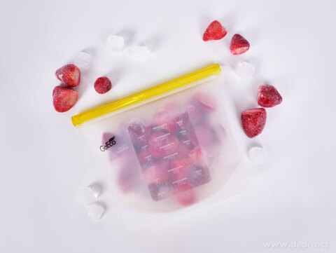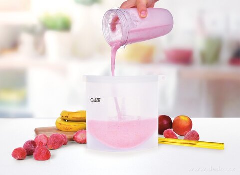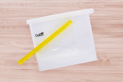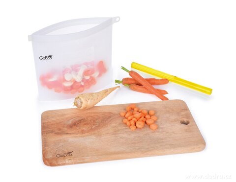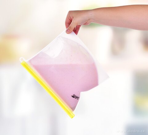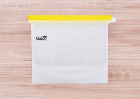 DOŻYWOTNI SILIWOREK GoEco® 1500 ml wielofunkcyjny silikonowy woreczek na żywność wielokrotnego użytku ze skalą pomiarową, hermetyczne zamknięcie z plastikowym klipsem. Odporny na temperatury od -30 °C do 230 °C. Wymiary ok. 21 x 26 cm.