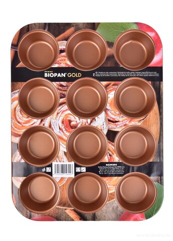 BIOPAN® GOLD forma na 12 muffinów oraz babeczek 35 × 27 cm z nieprzywierającą powłoką dla łatwego wyjmowania wypieków i prostej konserwacji. Idealna do słodkich i słonych muffinów, mini deserów lub babeczek. Wytrzymała, bez PFAS, odpowiednia do wszystkich typów piekarników.