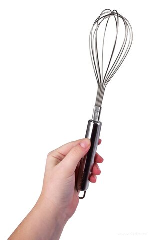 TRZEPACZKA do ubijania i mieszania, wysokiej jakości wykonanie z błyszczącej stali nierdzewnej, z oczkiem do zawieszenia, długość 27 cm, średnica 5,5 cm.