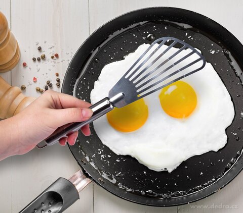 CAŁKOWICIE NIERDZEWNI PROFI POMOCNICY, wysokiej jakości wykonanie z błyszczącej stali nierdzewnej. Nierdzewna łopatka będzie świetnym pomocnikiem przy smażeniu na patelni albo nakładaniu potraw z brytfanny.