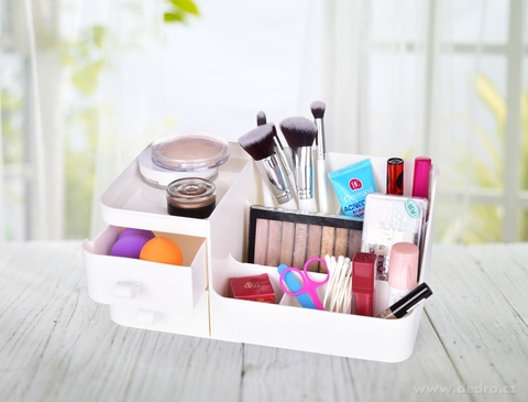 Organizer kosmetyczny BEAUTY z odpornego plastiku, 7 różnych przegródek i 2 wyjmowane szufladki.