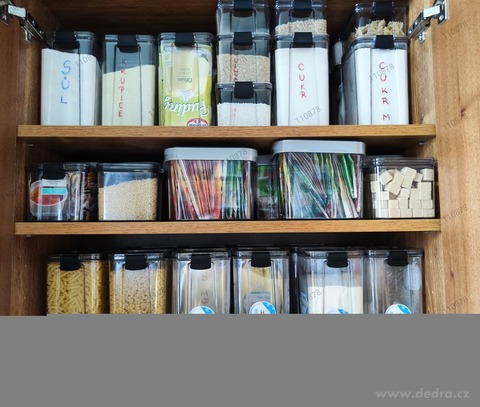Wykorzystasz do składowania sypkiej żywności bez opakowań np. na makarony, ryż, soczewicę, cukier, mąkę, kawę, herbatę liściastą, orzeszki, przyprawy…