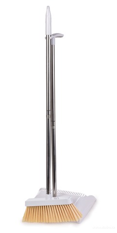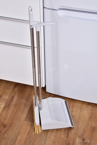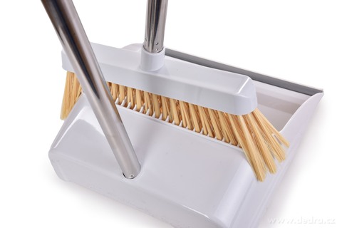 2w1 długa miotła z głęboką szufelką zakończoną silikonowym mankietem dla łatwego zbierania zanieczyszczeń, w górnej części łopatki praktyczne ząbki do oczyszczenia zmiotki. Połączenie wytrzymałego plastiku i metalu.