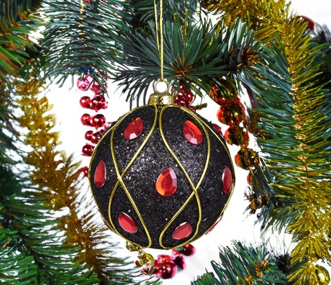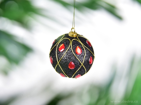 XL bombka z nowoczesnym zdobieniem, złote paski z czerwonymi kamykami.