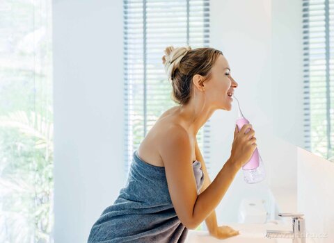Irygator dentystyczny dla całej rodziny, dzięki strumieniowi wody usuwa płytkę nazębną oraz zanieczyszczenia z przestrzeni międzyzębowej i z dziąseł.