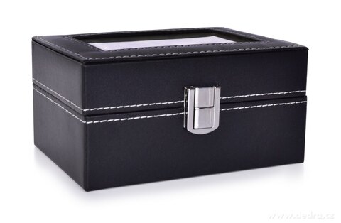 Luksusowe etui do przechowywania zegarków o wyglądzie wysokiej jakości skóry z metalowym zapięciem na zatrzask, na zegarki i bransoletki, które można umieścić wokół miękkiej, wyjmowanej poduszeczki ze sztucznego aksamitu, wnętrze również wyłożone sztucznym aksamitem. Pokrywa z hartowanym szkłem przymocowana satynową tasiemką. Połączenie drewna i ekoskóry