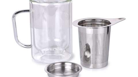 400 ml szklany dwuścienny kubek termiczny BOROSIL DOUBLE-GLASS z nierdzewnym sitkiem i pokrywką. Wymiary: 12 x 8 x 12 cm.