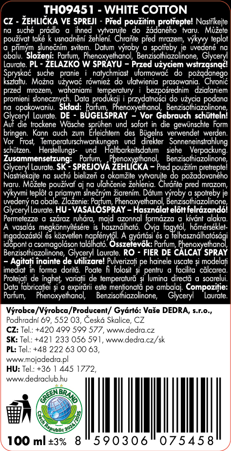 ECO spray do wyrównywania zagnieceń WHITE COTTON – idealny pomocnik w podróży i w domu. Wygładza zagniecenia oraz fałdy bez klasycznego prasowania. Wystarczy spryskać, wygładzić ręką i ewentualnie podsuszyć suszarką. Bez drażniących substancji, odpowiedni także do delikatnych materiałów. Szybkie rozwiązanie bez żelazka.